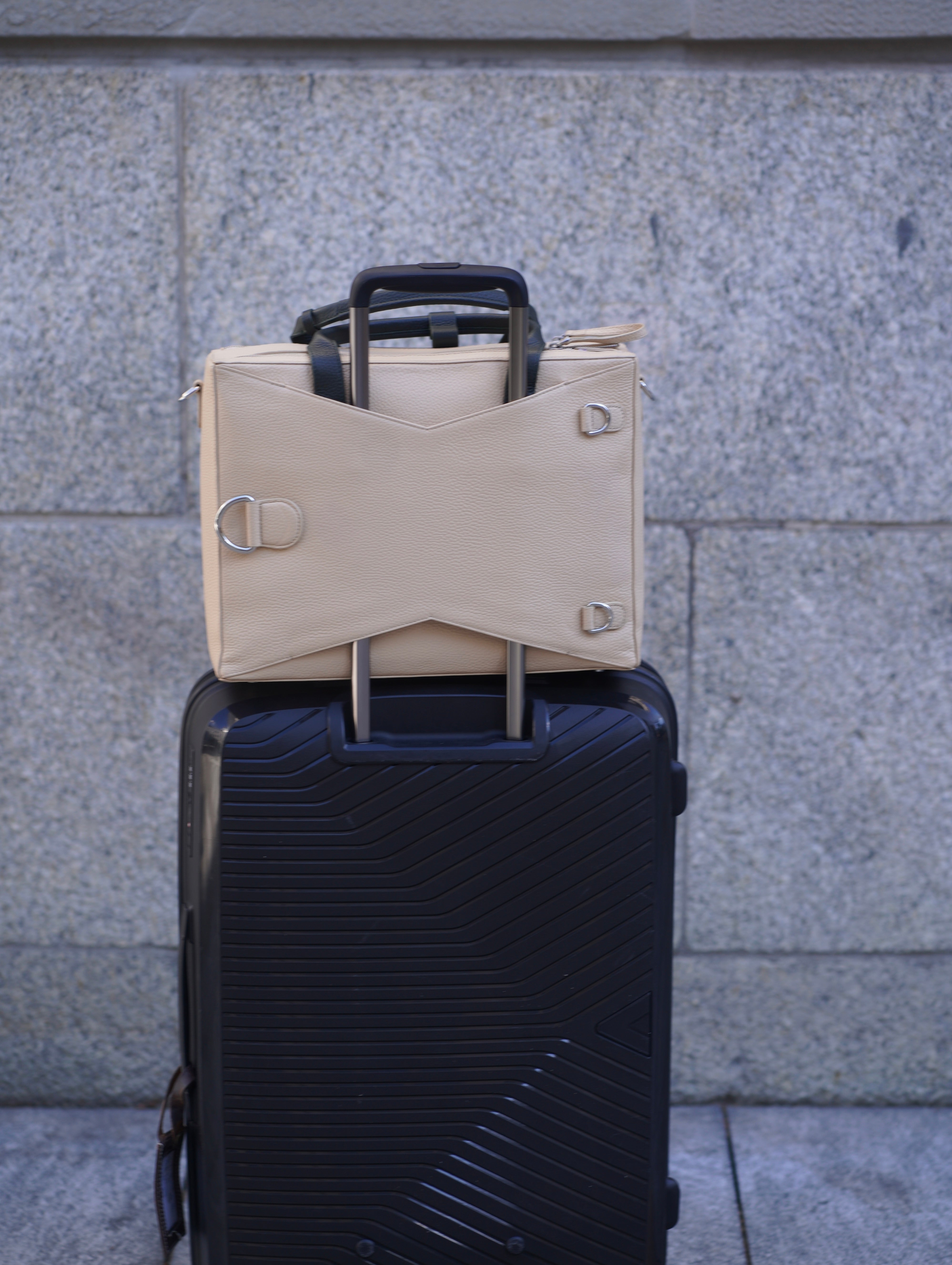 It has adjustable leather straps that easily convert it from a shoulder bag to a backpack, with trolley slider.